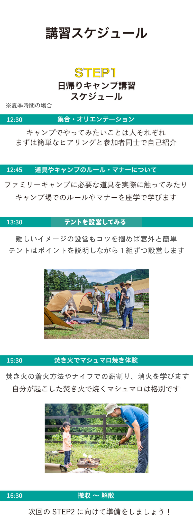 | STEP2 / (宿泊講習 道具フルレンタル) | 宿泊費、講習費、キャンプに必要な道具一式、薪、炭1回分 |