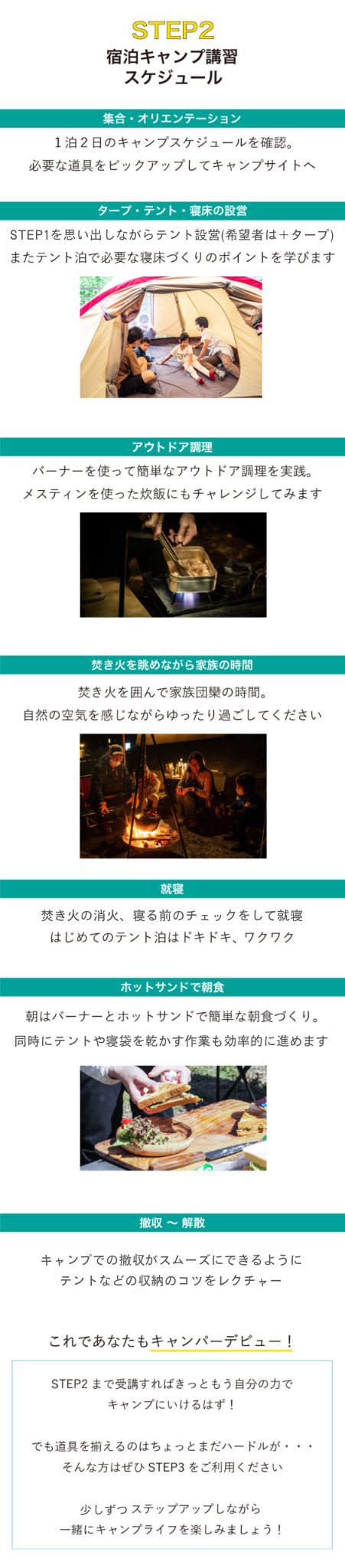 | STEP3(道具レンタル) | 宿泊費、キャンプに必要な道具一式、インストラクターサポート |