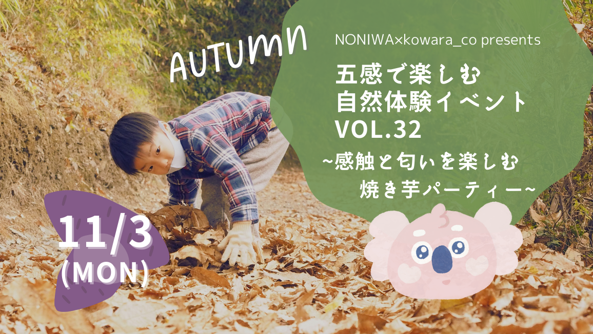 11月の今回は、秋の葉っぱ探しやさつまいも収穫、焚き火体験、焼き芋パーティーなど、秋の自然を感じながら全力で遊びます!五感の中でも「触覚」「嗅覚」にフォーカスを当て、土・さつまいもの触り心地や枯れ葉の感触、さつまいもが焼ける匂い、、など子ども自身の気づきを大切にしていきます。