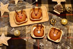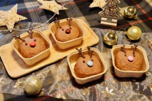 できあがっている生地をきれいに丸めて、トナカイの形に仕上げます。チョコペンで立派なツノを作ったら完成です。