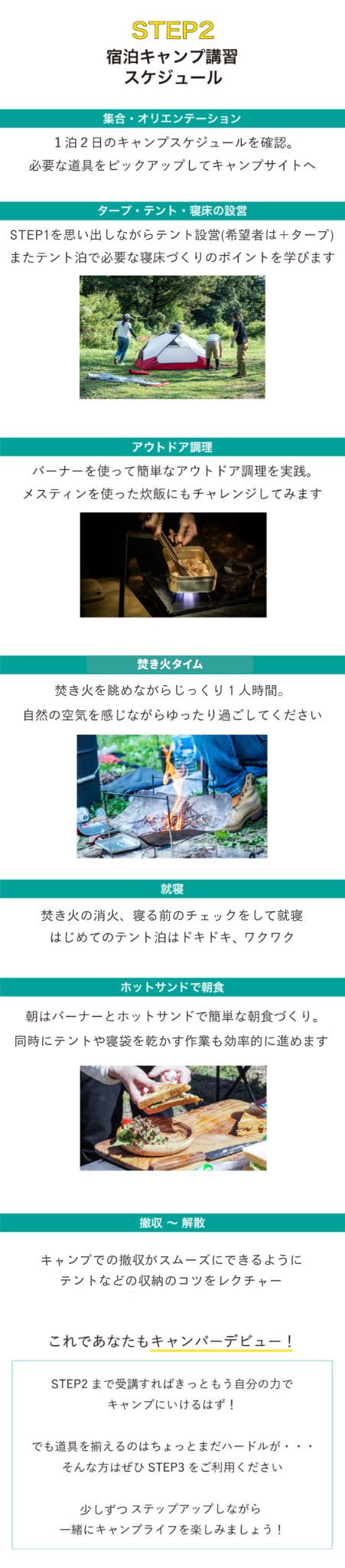 | STEP3(道具レンタル) | 宿泊費、キャンプに必要な道具一式、インストラクターサポート |